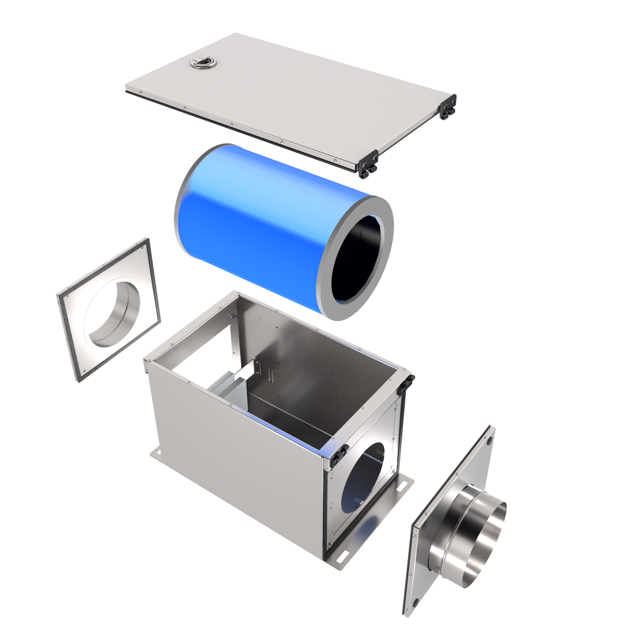 Имеет встроенный фильтр H13 увеличенной площади и срока службы. Герметичное прижатие фильтра и верхней крышки за счет EPDM резинового уплотнения. Теплошумоизолированный корпус из экологичной нержавеющей стали.