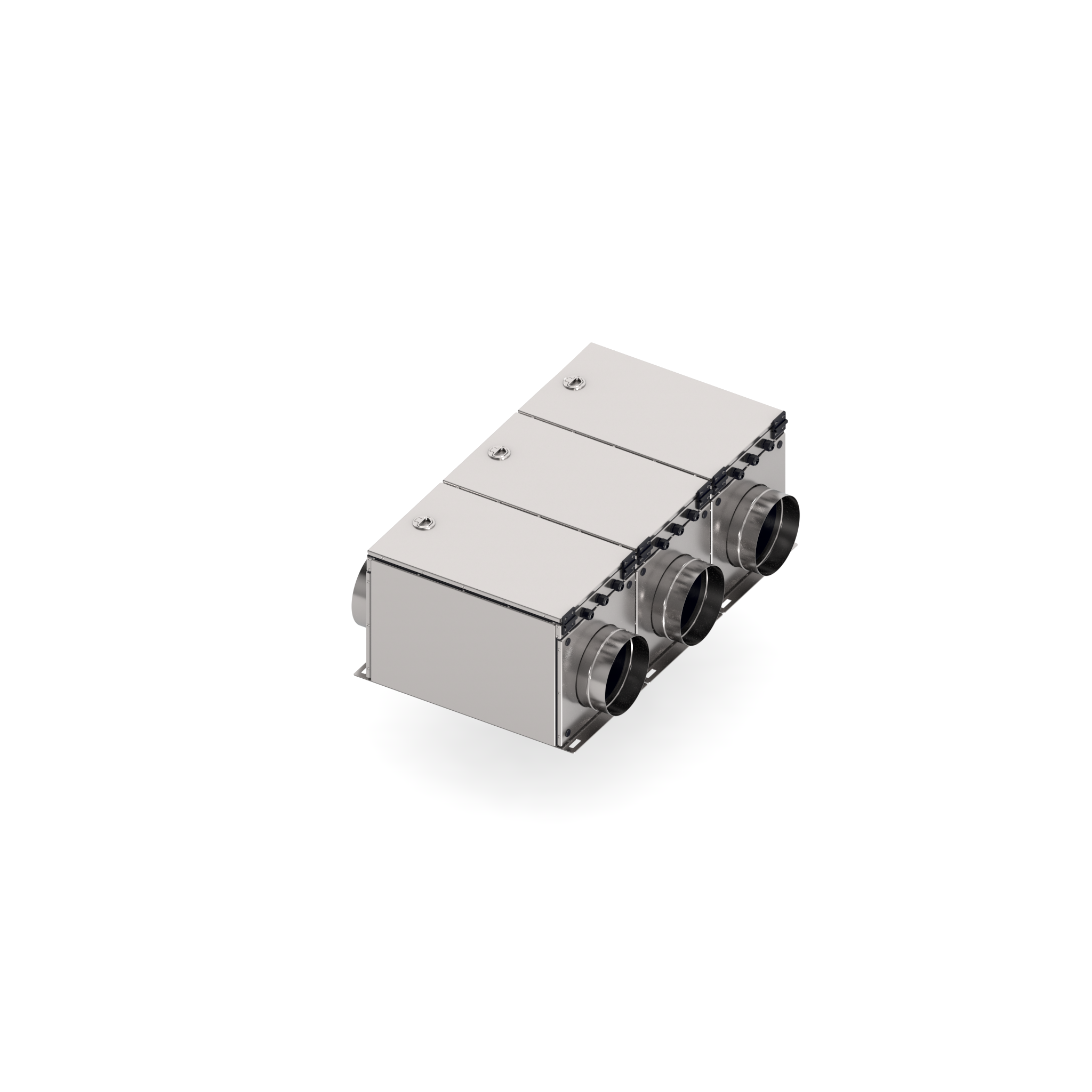 Вытяжная установка Лайфа Модуль, состоящая из 3-х модулей, суммарной максимальной производительностью 2400 м3/час, с фильтром класса очистки воздуха G4, автоматикой WF. В комплекте 3*4 дополнительных фильтра.